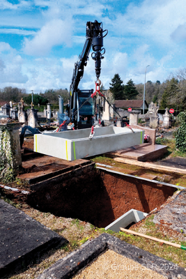 Des rallonges de pattes sont également disponibles pour les endroits les plus difficiles. Avec sa profondeur de fouille de 3,90 m et sa capacité de levage de 1 000 kg à 2 m (830 kg à 3 m), elle permet tous les travaux de creusement, de reprises de concessions et de pose de monuments. Enfin, une gamme d’accessoires permet de l’adapter à toutes les exigences du secteur funéraire : marteau hydraulique, tarière, benne preneuse, crochet de levage, croc béton… c’est le couteau suisse des pelles hydrauliques.